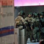 Law enforcement personnel shield civilians outside a garage area at Fort Lauderdale–Hollywood International Airport, Friday, Jan. 6, 2017, in Fort Lauderdale, Fla. A gunman opened fire in the baggage claim area at the airport Friday, killing several people and wounding others before being taken into custody in an attack that sent panicked passengers running out of the terminal and onto the tarmac, authorities said. (AP Photo/Wilfredo Lee)