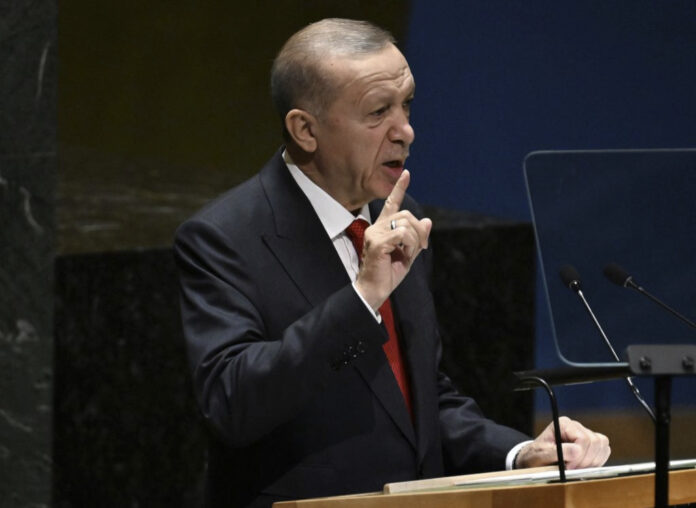 In the worldview of Turkish President Recep Tayyip Erdoğan, Islamophobia is the greatest threat to humanity. Radical Islamist suicide bombers and torturers are not. Pictured: Erdoğan addresses the United Nations General Assembly in New York City on September 19, 2023. (Photo by Ed Jones/AFP via Getty Images)