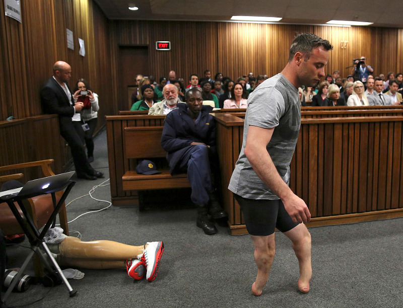 15 Ιουνίου: Ο Οσκαρ Πιστόριους προσπαθεί να υπερασπιστεί τον εαυτό του και βγάζει τα προσθετικά του πόδια. Περπατά ενώπιον των δικαστών που κρίνουν για μια ακόμη φορά την τύχη του ως δολοφόνου της αγαπημένης του Ρίβα Στέενκαμπ.