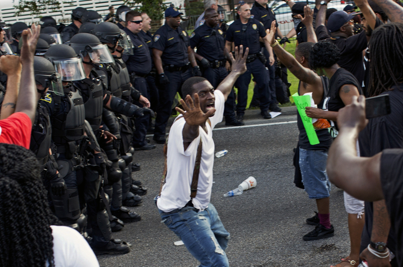 9 Ιουλίου: Ενας άνδρας μπαίνει ανάμεσα στους διαδηλωτές και τους αστυνομικούς, στο Μπατόν Ρουζ της Λουιζιάνα κατά τη διάρκεια των μεγάλων διαδηλώσεων που έγιναν και εκεί και σε άλλες πόλεις των ΗΠΑ με αφορμή τα περιστατικά θανάτου μαύρων διαδηλωτών από λευκούς αστυνομικούς.
