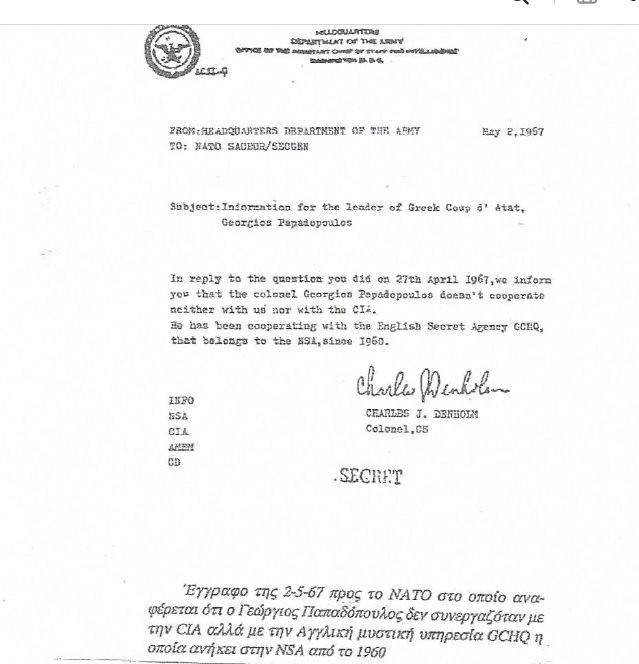 Β’.Επίσης εις το έγγραφον της CIA πού λέγει ότι ο Παπαδόπουλος δεν συνειργάζετο μετ’ αυτής αλλά με έναν Κλάδον της Βρετανικής Υπηρεσίας είναι αληθές κι’ αναφέρεται εις την 10ετίαν τού 1952-54 που ο Γ.Παπαδόπουλος ήτο Τμηματάρχης Αντικατασκοπείας και βασει της εισόδου μας εις το ΝΑΤΟ το 1952 μ’ αυτό το Τμήμα εκαθορίσθη να έχη συνεργασίαν Υπηρεσιακήν. Μή παροράς ότι αυτή η Βρετανική Υπηρεσία είναι εκείνη πού εδωκεν την πληροφορίαν το 1952 εις την εδώ ΚΥΠ ότι ο Ζαχαριαδης εκαρφωσε τον Μπελογιαννη ερχόμενον εις την Ελλάδα αφού κατά τον ΥΠΕΞ της ΕΣΣΔ Βιάτισλαβ Μολότωφ ήτο γνωστόν και εις τον Σταλιν ότι ο Ζαχαριαδης ήτο πρακτωρ και της INTELIGES SERVICE.Τούτο δεν σημαίνει όμως ότι επειδή συνειργάζετο επισήμως με το αντίστοιχον Βρετανικόν Τμήμα ήτο και πρακτωρ. Τότε εκατοντάδες Αξιωματικοί που συνεργάζονται με τάς Υπηρεσίας της ΣΙΑ ,Μ18 κ.λπ θα έπρεπε να θεωρηθούν ως πρακτορες. Δι’ ονομα τού Θεού.