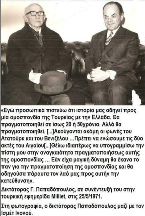 Κοίτα να δεις-δούμε, μυαλό ο δικός μας δικτάτορας Γεώργιος Παπαδόπουλος ,που μας βγήκε και Βενιζελικός και Κεμαλικός -οι ”δημοκράτες ” και οι αριστεροί ΒΕΒΑΙΩΣ τον χρεώνουν στην σκληρή Δεξιά-.