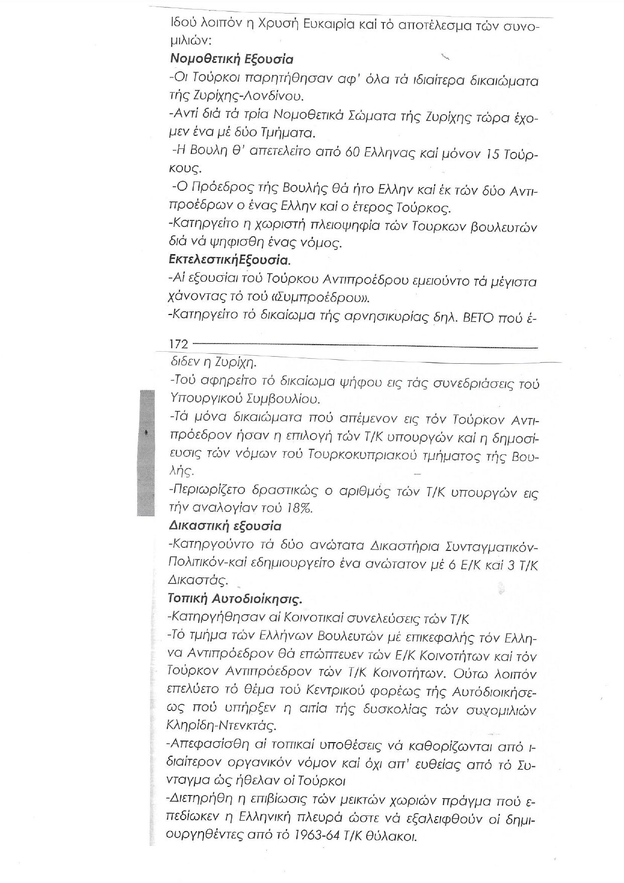 «…Η Ελλνοκυπριακή πλευρά έκαμεν όλας τάς απαραιτήτους ενεργείας προκειμένου προωθηθή ο διάλογος έν τούτοις αι παράλογοι απαιτήσεις τών Τ/Κ και η δυσπιστία δέν επέτρεψαν ικανοποιητικήν εξέλιξιν».