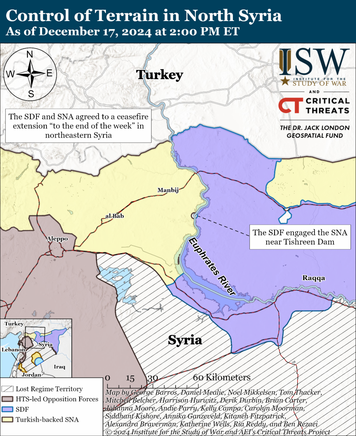 Οι υποστηριζόμενες από τις ΗΠΑ Συριακές Δημοκρατικές Δυνάμεις (SDF) και ο υποστηριζόμενος από την Τουρκία Συριακός Εθνικός Στρατός (SNA) συμφώνησαν να παρατείνουν την προσωρινή κατάπαυση πυρός στη βορειοανατολική Συρία «μέχρι το τέλος της εβδομάδας». Η κατάπαυση του πυρός αρχικά επρόκειτο να διαρκέσει από τις 12 έως τις 16 Δεκεμβρίου. Το SNA και η Τουρκία ανέπτυξαν πυροβολικό και μαχητές στην πρώτη γραμμή γύρω από το Κομπάνι στις 17 Δεκεμβρίου πριν από την επέκταση της εκεχειρίας Στοιχεία των SDF υπό το Στρατιωτικό Συμβούλιο του Manbij ενεπλάκησαν με το SNA στο φράγμα Tishreen για αρκετές ώρες στις 17 Δεκεμβρίου, αλλά οι μάχες περιορίστηκαν κυρίως στην περιοχή.