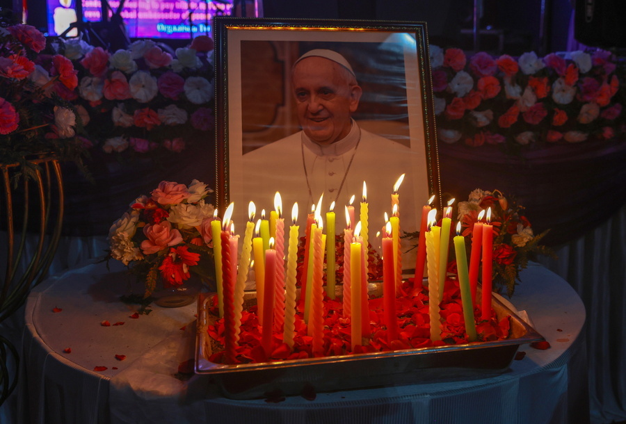 Candles are placed in front of a portrait during an inter faith memorial meeting to mourn the death of Pope Francis in New Delhi, India, 21 April 2025. EPA/RAJAT GUPTA epa12044741 Candles are placed in front of a portrait during an inter faith memorial meeting to mourn the death of Pope Francis in New Delhi, India, 21 April 2025. Pope Francis died on 21 April 2025 at the age of 88, according to the Holy See. Born Jorge Mario Bergoglio in Buenos Aires, Argentina, on 17 December 1936, he was appointed leader of the Catholic Church on 13 March 2013, succeeding Pontiff Emeritus Benedict XVI. EPA/RAJAT GUPTA
