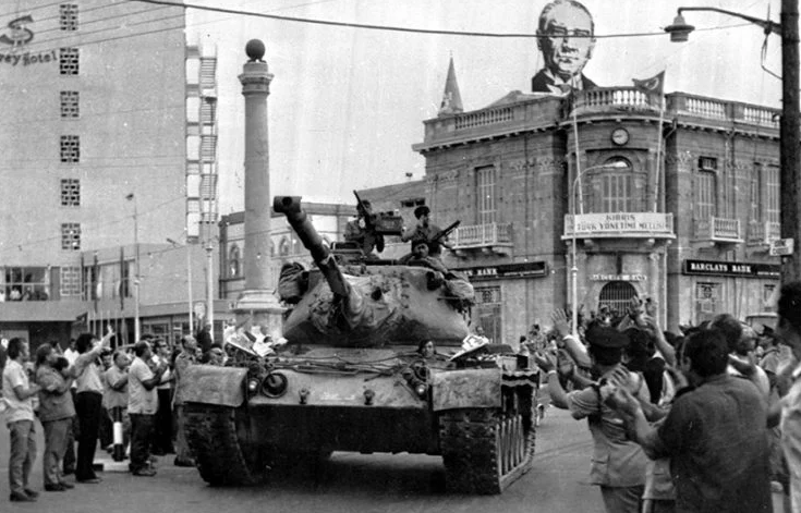 24 Ιουλίου 1974. Ένα τουρκικό τανκ περνάει μπροστά απ’ το Saray Hotel στο κατεχόμενο μέρος της Λευκωσίας. Στην οροφή του διπλανού κτηρίου διακρίνεται πανό με τον Μουσταφά Κεμάλ (φωτ.: αρχείο Associated Press)