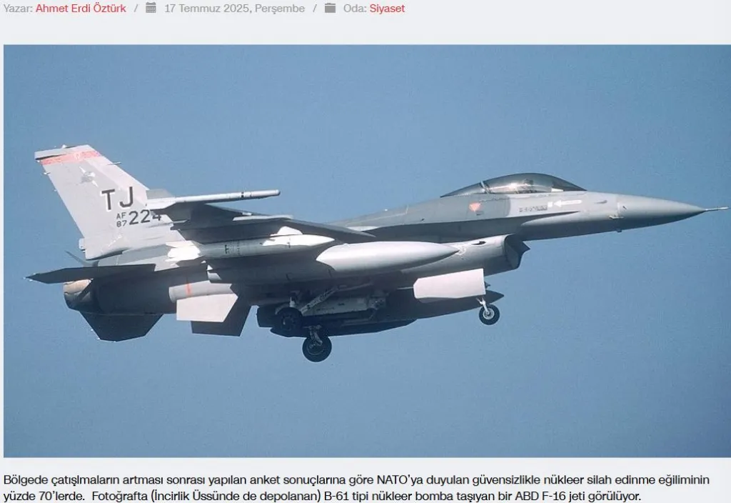 Ο αρθρογράφος του Yetkinreport, Αχμέτ Ερντί Οζτούρκ, έγραψε ότι, σύμφωνα με μια έρευνα που ολοκληρώθηκε πρόσφατα, περισσότερο από το 70% της τουρκικής κοινωνίας τάσσεται υπέρ της απόκτησης πυρηνικών όπλων από την Τουρκία.