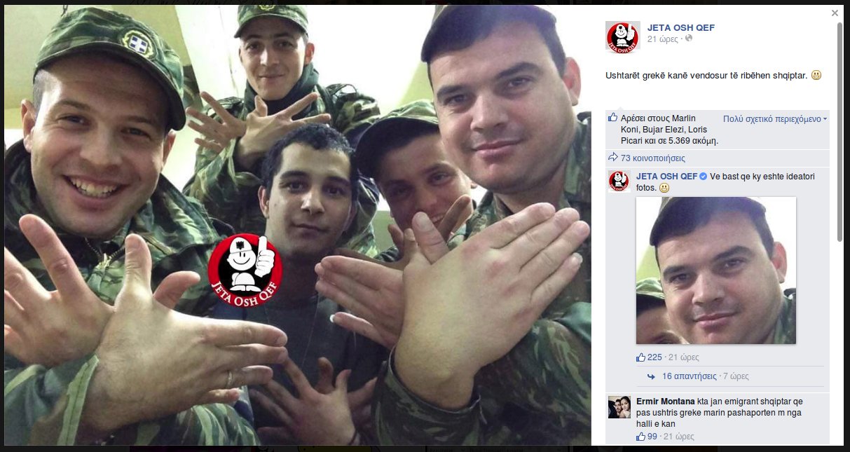 Τότε μια φωτογραφία είχε «ανέβει» σε Αλβανική «ομάδα» στο Facebook και έδειχνε πέντε νεαρούς να σχηματίζουν με τα χέρια τους, το σύμβολο του αλβανικού αλυτρωτισμού, τον αλβανικό αετό.