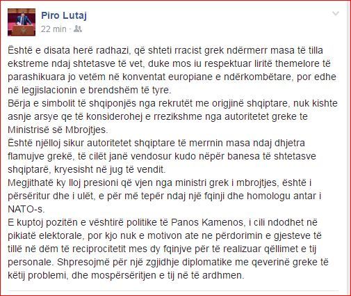 «Για πολλοστή φορά, το ελληνικό ρατσιστικό κράτος παίρνει τέτοια ακραία μέτρα εναντίον των πολιτών του, χωρίς να σέβεται τις βασικές ελευθερίες που προβλέπονται όχι μόνο από τις ευρωπαϊκές και τις διεθνείς συμβάσεις, αλλά και από την εσωτερική του νομοθεσία. Οι Αρχές του Υπουργείου Άμυνας, δεν είχαν κανένα λόγο να θεωρήσουν επικίνδυνο, το σχηματισμό του συμβόλου του αετού από τους νεοσύλλεκτους αλβανικής καταγωγής. Είναι σαν οι αλβανικές αρχές να λαμβάνουν μέτρα εναντίον δεκάδων ελληνικών σημαιών, οι οποίες έχουν αναρτηθεί παντού σε σπίτια Αλβανών υπηκόων, κυρίως στην νότια περιοχή της χώρας…