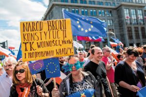 Pro-EU protesters at a demonstration against Poland’s right-wing government, Warsaw, May 2016. The sign says, ‘The people defend the Constitution as well as freedom, laws, and the threefold form of government.’