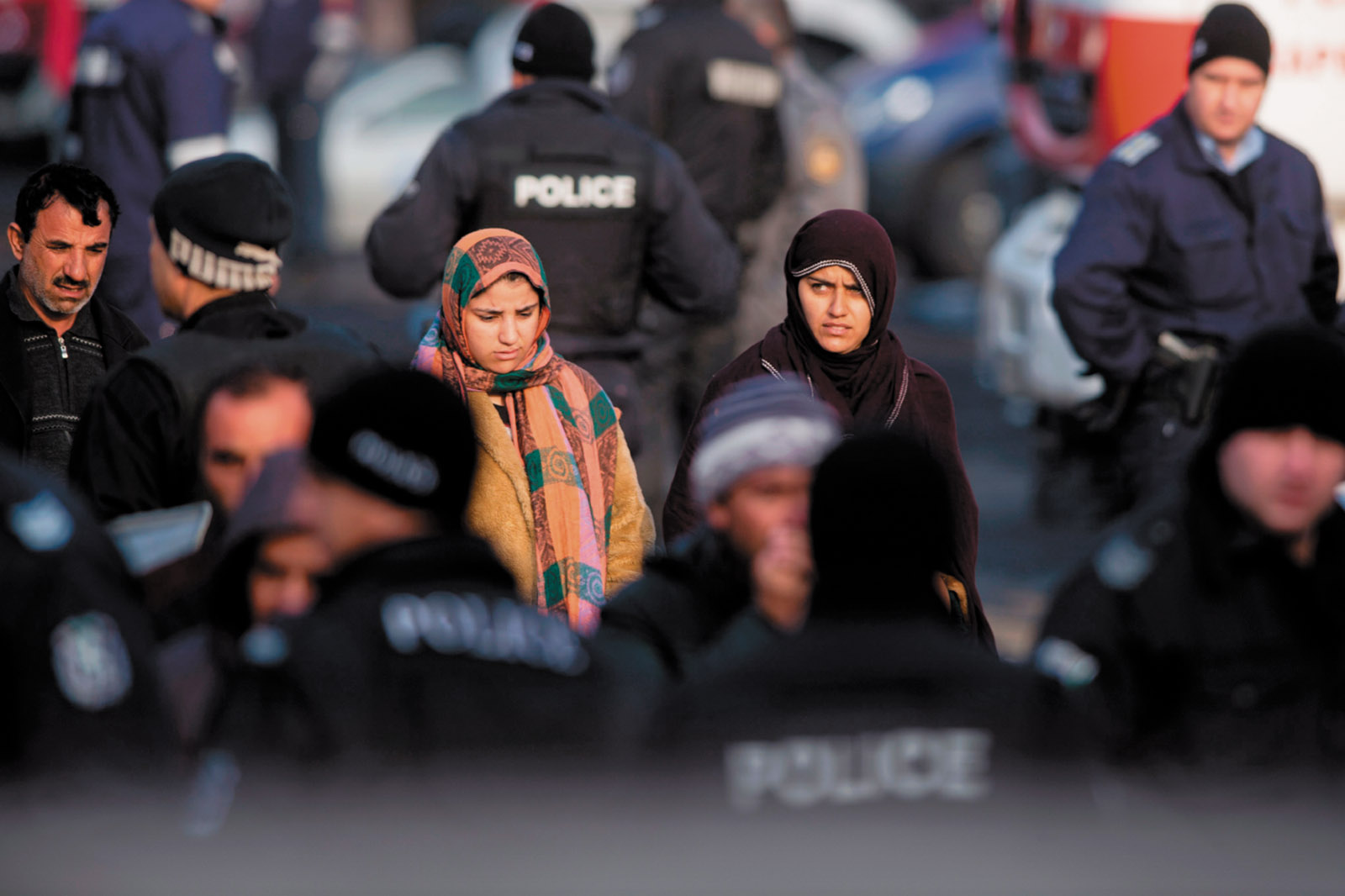 Migrants and riot police at the Harmanli refugee camp in southern Bulgaria, near the Greek and Turkish borders, November 2016