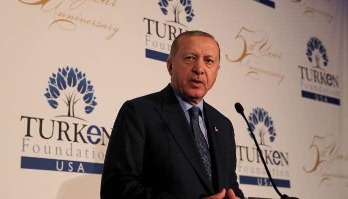 Turkish President Recep Tayyip Erdoğan delivers a speech on the traditional gala dinner of TURKEN foundation at Mandarin Hotel as he arrives at New York to participate in the 73rd session of UN General Assembly on September 24, 2018 in New York, United States. AFP PHOTOS