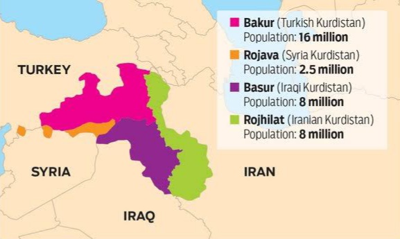 Κατ αρχάς ορισμένες διευκρινήσεις: Οι Κούρδοι, όπως θα γνωρίζετε, βρίσκονται σε εδαφικές επικράτειες, τουλάχιστον, τεσσάρων χωρών. Και ονομάζουν τις περιοχές που ζουν με δικά τους ονόματα. Για την πληροφόρησή σας τις ονομάζουν ως εξής: