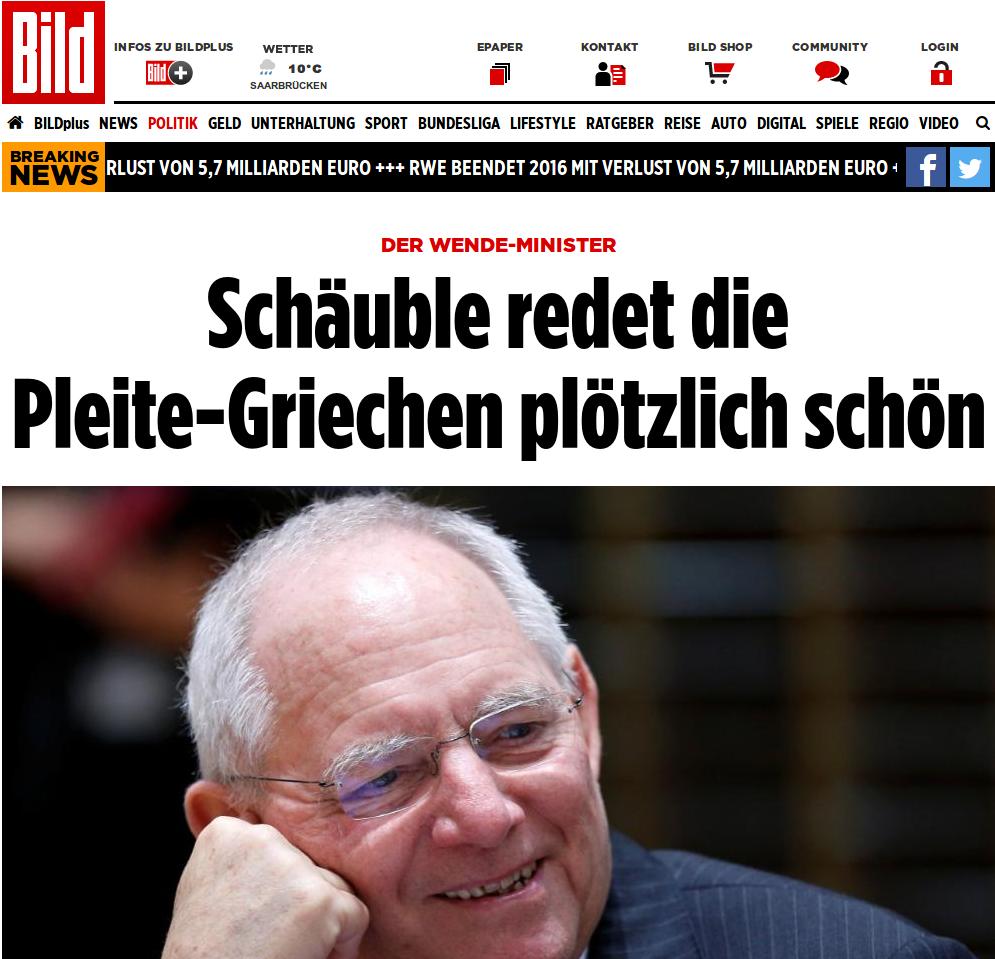 «Τρεις βδομάδες πέρασαν αφότου ο Σόιμπλε επανέφερε στο τραπέζι το Grexit λόγω της απροθυμίας της Αθήνας για μεταρρυθμίσεις», γράφει η Bild. «Στα τέλη Ιανουαρίου ο Σόιμπλε εξαπέλυε πυρά κατά των Ελλήνων: “Δεν ξέρω τι σκέφτεται η ελληνική κυβέρνηση, που δεν έχει κάνει ακόμη αυτά τα οποία τόσο συχνά δεσμεύτηκε να κάνει”: Στη συνάντηση των υπουργών Οικονομικών στις Βρυξέλλες ξαφνικά ακούμε: “Η Ελλάδα είναι σε καλό δρόμο!”. Τι μεσολάβησε στο μεταξύ; Έκανε η Αθήνα μεταρρυθμίσεις; Οχι!