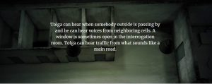 Tolga can hear when somebody outside is passing by and he can hear voices from neighboring cells. A window is sometimes open in the interrogation room. Tolga can hear traffic from what sounds like a main road.