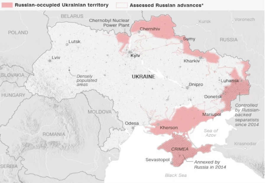 Στις 26 Φεβρουαρίου δυνάμεις της Ρωσίας εισέβαλαν στη Μελιτόπολη, περίπου 130 χλμ βορειοανατολικά της Κριμαίας, ένα 24ωρο αργότερα στο Μπερντιάνσκ, κάπου 120 χλμ δυτικότερα, και στις 3 Μαρτίου στη Χερσώνα των 280.000 κατοίκων, τη μοναδική μεγάλη πόλη της Ουκρανίας που έχει πέσει μέχρι στιγμής στα χέρια τους.