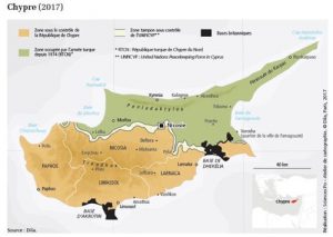- Source de cette carte de Chypre en 2017 : Mathieu Petithomme « Chypre : l’impasse des pourparlers de réunification », Questions internationales n°87 – septembre-octobre 2017, La documentation Française.