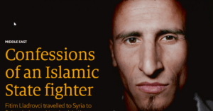 Lladrovci spent a year on the battlefield in Syria before returning to Kosovo. He was imprisoned for three years – technically for hate speech, not for his activities with IS – then went back to Obilic. His only regret, he says, is having left Syria in the first place. “I would return tomorrow if I could,” he says. A higher share of Kosovo’s population has travelled to Syria to join IS than that of any other country. Between 2014 and 2016, more than 300 made the journey to Syria from one of Europe’s poorest states, according to the New York Times.