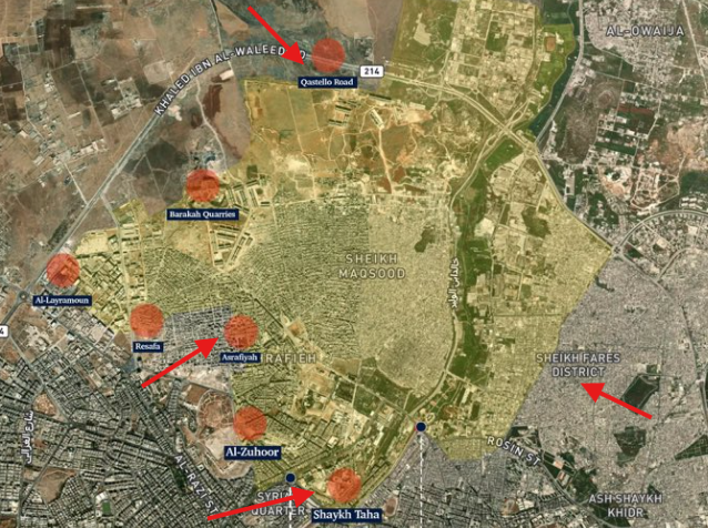 Οι τρομοκράτες της HTS προχώρησαν προς τον «κυκλικό κόμβο της Πλατείας Μαρτύρων» στη γειτονιά Ασραφίγια και ετελεσαν αμαχους.., και οι συγκρούσεις συνεχίζονται κοντά στο Σεΐχ Μακσούντ και ολόκληρο το ανατολικό μέτωπο βρίσκεται υπό τον έλεγχο των δυνάμεων ασφαλείας των Asayîş. Η μικρη προελαση των τρομοκρατων εγινε με προδοσια. οι δυναμεις Ασαουις ξεκινησαν αντεπιθεση.