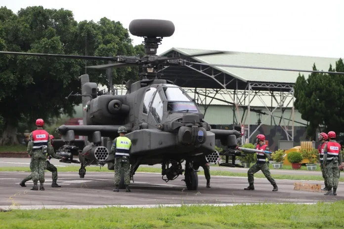 File photo Μια φωτογραφία που διατέθηκε από το Στρατιωτικό Πρακτορείο Ειδήσεων δείχνει έναν στρατιώτη να προσαρτά έναν πύραυλο σε ένα στρατιωτικό ελικόπτερο AH-64 του Στρατού της Ταϊβάν.EPA/MILITARY NEWS AGENCY HANDOUT HANDOUT EDITORIAL USE ONLY/NO SALES