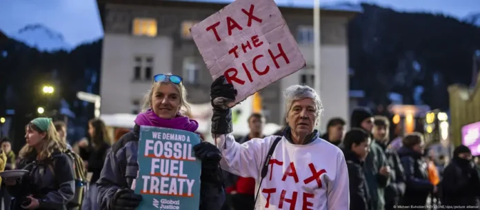 Μικρή, αλλά ηχηρή, είναι η συγκέντρωση διαμαρτυρίας στην κεντρική Πλατεία του Ταχυδρομείου, στο χιονισμένο Νταβός. Μερικές εκατοντάδες νέοι άνθρωποι έχουν συγκεντρωθεί στην πλατεία και φωνάζουν συνθήματα, όπως «Eat the Rich» («Φάτε τους πλούσιους»), αλλά και «Tax the Rich» («Φορολογήστε τους πλούσιους»). Το αίτημα για υψηλότερη φορολόγηση των υψηλών εισοδημάτων έχει ακουστεί και παλαιότερα στο Νταβός. Κάποιοι επιχειρούν μία συμβολική διαμαρτυρία, μπλοκάροντας τον κεντρικό δρόμο για λίγη ώρα. Μαύρες λιμουζίνες περνούν μπροστά από τους διαδηλωτές.