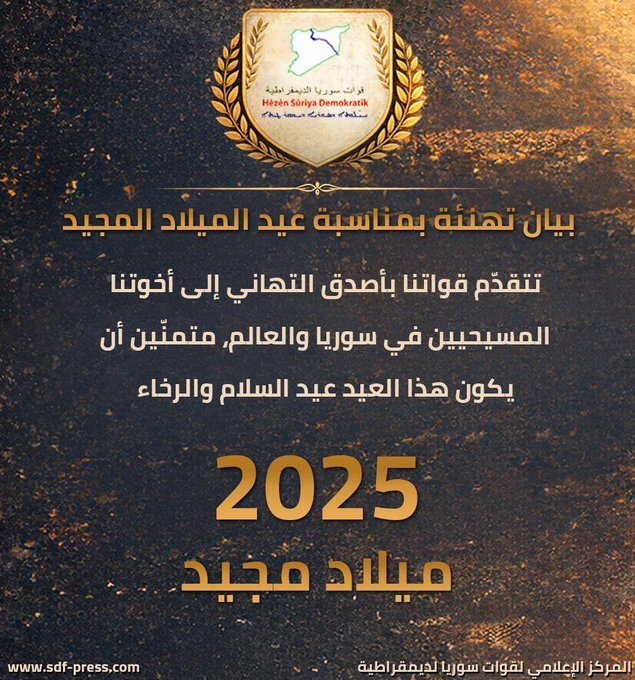 Συγχαίρουμε τους Χριστιανούς της Συρίας και του κόσμου, και τους Χριστιανούς μαχητές μας όλων των δογμάτων, για την ένδοξη γέννηση του Χριστού, ευχόμενοι να επικρατήσει η ειρήνη σε όλο τον κόσμο. Την ημέρα αυτή, θυμόμαστε τις αξίες της αγάπης και της αδελφοσύνης που κήρυξε ο Ιησούς Χριστός, ειρήνη σε αυτόν, και είμαστε γεμάτοι ελπίδα και αποφασιστικότητα ότι αυτές οι αξίες θα επικρατήσουν στη Συρία και ότι όλες οι κοινότητές της, ιδιαίτερα οι Χριστιανοί αδελφοί και αδελφές μας, θα απολαύσουν την ειρήνη που τους αξίζει. Μαζλουμ Αμπντι!!!