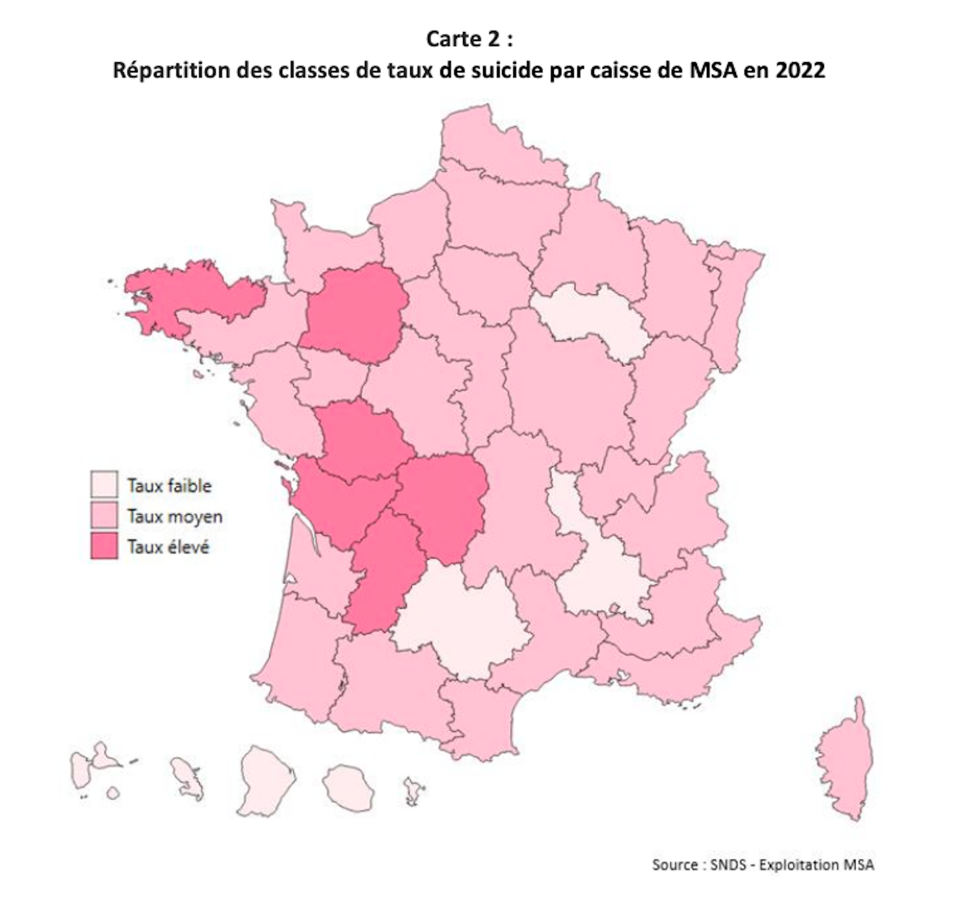Il touche plus particulièrement les hommes entre 45 ans et 54 ans et les plus de 65 ans, avec des disparités régionales marquées. Les taux de suicide supérieurs à la moyenne nationale se concentrent particulièrement dans les territoires ruraux et semi-ruraux de la France. La MSA identifie plusieurs territoires particulièrement à risque, dont la Bretagne et plus largement l’Armorique, la Dordogne et le Lot-et-Garonne, le Poitou, la Mayenne, l’Orne et la Sarthe, le Limousin, ainsi que les Charentes.
