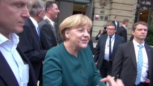 German Chancellor Angela Merkel (center) was asked how Europe could be protected against Islamization. Merkel, who has a personal security team of 15-20 armed bodyguards around her, working in shifts, answered: “Fear is not a good adviser.” (Image source: Paralax video screenshot)
