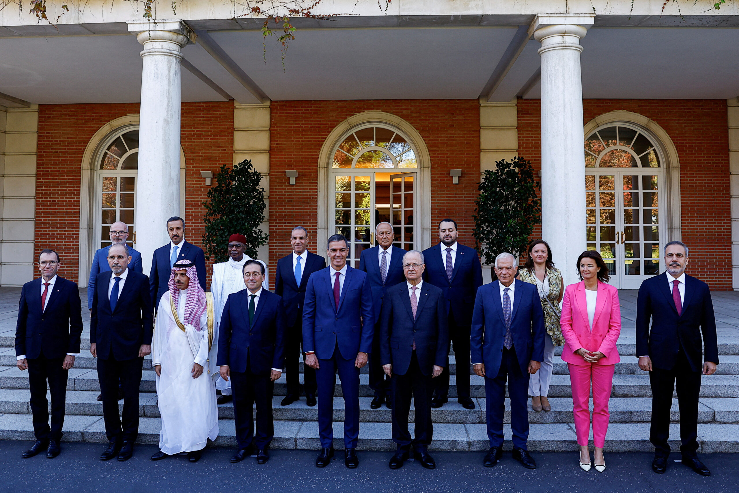 Item 1 of 4 Spain’s Prime Minister Pedro Sanchez poses for a family photo with Spain’s Foreign Minister Jose Manuel Albares, Spain’s Secretary General for Foreign Affairs Emma Aparici, European Union foreign policy chief Josep Borrell, Palestinian Prime Minister Mohammad Mustafa, Saudi Arabia’s Foreign Minister Prince Faisal bin Farhan Al-Saud, Jordan’s Foreign Minister Ayman Safadi, Slovenian Foreign Minister Tanja Fajon, Norway’s Foreign Minister Espen Barth Eide, Turkey’s Foreign Minister Hakan Fidan, Egypt’s Foreign Minister Badr Abdelatty, Secretary-General of the Arab League Ahmed Aboul Gheit, Secretary-General of the Organisation of Islamic Cooperation Hissein Brahim Taha, Qatar’s Minister of State Mohammed bin Abdulaziz Al-Khulaifi, Bahrain’s Undersecretary of the Ministry of Foreign Affairs for Political Affairs Shaikh Abdulla bin Ahmed Al Khalifa and Ireland’s UN Policy Director and Director of the UN Security Council Task Team Gerard Keown, on the day of a meeting at Moncloa Palace in Madrid, Spain, September 13, 2024. REUTERS/Susana Vera REFILE – REMOVES ID – “NIGERIA’S PERMANENT SECRETARY OF THE MINISTRY OF FOREIGN AFFAIRS DUNOMA UMAR AHMED\