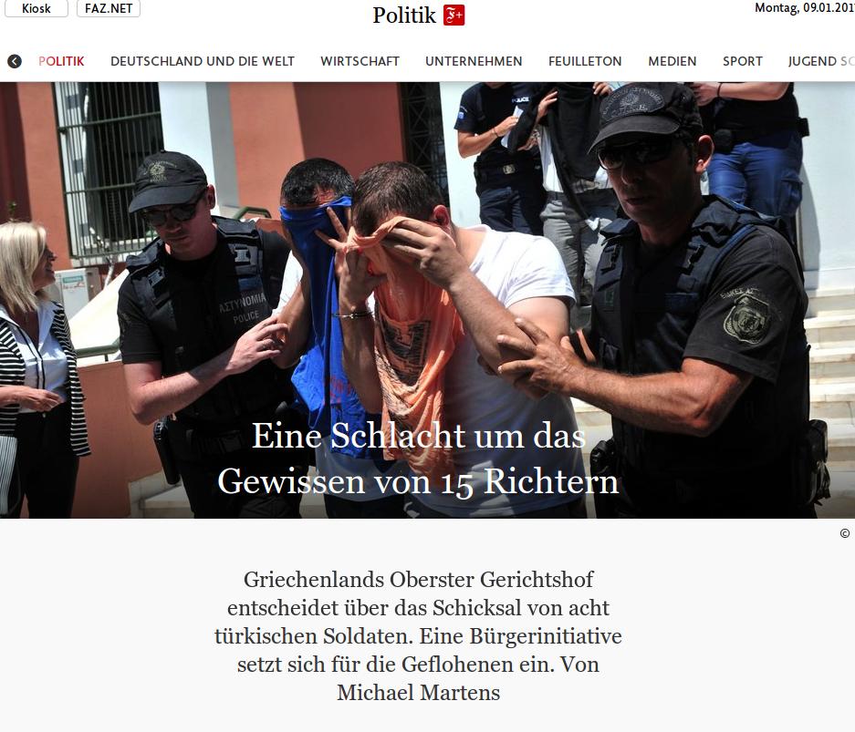 Η FAZ αναφέρεται στη συνέχεια στην πρωτοβουλία κατά της έκδοσης των Τούρκων αξιωματικών από Ελληνες πολίτες και τον Απόστολο Δοξιάδη, ο οποίος «καθιστά σαφές ότι το θέμα δεν αφορά στις κομματικές προτιμήσεις, αλλά στο κατά πόσον η Ελλάδα μπορεί να διατηρήσει την ιδιότητα κράτους δικαίου υπό την πίεση της μακράν ισχυρότερης από τις τέσσερις γειτονικές της χώρες».