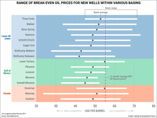 This chart shows the range of break-even oil prices for new wells in the US Lower 48, the Gulf of Mexico, and Canada. For many of these wells, the break-even point has dipped well below $60 a barrel. And that means 2018 is going to be another year of oil prices that are too low to solve the fundamental problems of Iran, Saudi Arabia, and Russia in particular.
