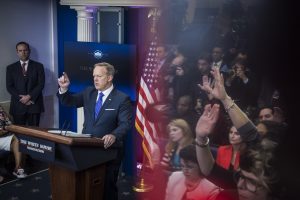 White House Press secretary Sean Spicer points as he answers questions from members of the media, seen reflected in an exit sign, during the daily briefing. (Jabin Botsford/The Washington Post)