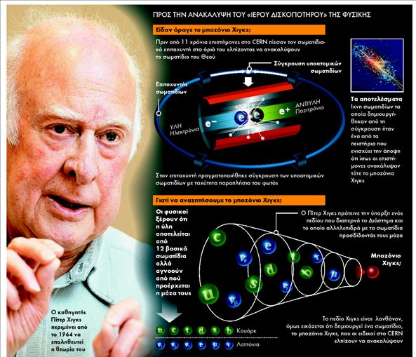 Απ 5η: Αυτές είναι αρκετά τεχνικές ερωτήσεις. Το σωματίδιο του Higgs είναι ένα πολύ σημαντικό συστατικό σε αυτό που αποκαλούμε καθιερωμένο πρότυπο (standard model) ξεκινώντας από τη δεκαετία του εβδομήντα και κατά τη διάρκεια του μεγαλύτερου μέρους της, οι εξελίξεις στον κλάδο μας μπορούν να περιγράψουν ότι ανακαλύψαμε ένα μοναδικό σύνολο εξισώσεων για να περιγράψουμε όλα τα σωματίδια που βλέπουμε, οι οποίες είναι κβαντομηχανικές, και αυτές οι εξισώσεις δουλεύουν τόσο καλά ώστε κάθε πείραμα που έχει γίνει από τότε μπορεί πραγματικά να εξηγηθεί με όρους ενός απλού μοντέλου και έχει γίνει γνωστό σαν το καθιερωμένο πρότυπο. Το αποκαλούμε καθιερωμένο πρότυπο γιατί δεν πιστεύουμε ότι μπορεί να είναι η απόλυτη αλήθεια. Εννοώ ότι σε προηγούμενες συζητήσεις μου λένε γιατί δεν λες ότι το καθιερωμένο πρότυπο είναι όλα όσα διαθέτουμε σήμερα, είναι ό,τι μπορούμε να δούμε και αυτό είναι το τέλος όλων. Αυτό δεν είναι αλήθεια. Το καθιερωμένο πρότυπο έχει κάποιες εσωτερικές αντιφάσεις, δεν μπορεί να είναι απόλυτα σωστό. Άρα ξέρουμε ότι υπάρχουν ασάφειες και ατέλειες, επομένως ξέρουμε ότι πρέπει να ψάξουμε για περισσότερα. Λοιπόν, το βασικό μοντέλο έχει υποστεί αρκετούς πειραματισμούς χωρίς εξαίρεση και αυτό είναι το σωματίδιο του Higgs. Επομένως το σωματίδιο του Higgs πρέπει ακόμη να προσδιοριστεί με πειράματα και η δυσκολία σε αυτό είναι ότι δεν μπορείς να προβλέψεις τη μάζα του ακριβώς. Αυτό λοιπόν το κάνει πολύ δύσκολο για τους πειραματιστές να ανιχνεύσουν πραγματικά το σωματίδιο. Δεν ξέρουν πόσο βαρύ είναι, δεν ξέρουν πού να ψάξουν για το σωματίδιο επειδή τα βαρύτερα σωματίδια χρειάζονται διαφορετικά σήματα από τα ελαφρά σωματίδια. Εφόσον, λοιπόν, οι θεωρητικοί δεν μπορούν να υπολογίσουν τη μάζα του με πολλή ακρίβεια, οι πειραματιστές δυσκολεύονται πολύ να το βρουν. Οπότε ως τώρα έχουν εξαιρέσει τα σωματίδια του Higgs που είναι ελαφρύτερα από περίπου 100 GeV. Συνεπώς είναι πιθανό να είναι βαρύτερα από αυτό. Τώρα οι περισσότερες θεωρίες λένε ότι πρέπει πιθανόν να είναι περίπου 200 GeV. Οπότε είναι πολύ δύσκολο να οριοθετηθεί για να το ψάξουν οι πειραματιστές. Θα μπορούσε να βρίσκεται σε κάποια συγκεκριμένη περιοχή όπου απλώς είναι πολύ δύσκολο να βρεθεί. Άρα αν είναι ανάμεσα, δεν ξέρω, στα 130 ή 150 GeV ή κάτι τέτοιο, υπάρχει ένα παράθυρο όπου θα ήταν δύσκολο να ανιχνευτεί. Αν ήταν βαρύτερο, θα ήταν πιο εύκολο. Αν ήταν ακόμη βαρύτερο από αυτό θα ήταν πιο δύσκολο. Άρα εξαρτάται πάρα πολύ από το ποια θα είναι τελικά η πραγματική του μάζα το πόσο γρήγορα θα βρεθεί. Δεν έχει βρεθεί ακόμη. Οι περισσότεροι από μας είμαστε αρκετά αισιόδοξοι και εγώ επίσης είμαι αρκετά αισιόδοξος ότι το Higgs θα βρεθεί αρκετά σύντομα, πολύ πιθανόν σε μερικά χρόνια από τώρα, όταν οι μηχανές που θα φτιάξουμε στη Γενεύη, ο καινούριος επιταχυντής σωματιδίων ο οποίος λέγεται Μεγάλος Συγκρουστής Αδρονίων ( Large Hadron Collider – LHC) έχει όλα τα εχέγγυα που χρειάζονται για να ανιχνευθεί αυτό το σωματίδιο και να αναγνωρισθεί, να προσδιοριστεί ακριβώς ποια είναι η μάζα του, πώς διασπάται και ούτω καθ’ εξής. Αυτά είναι πολύ σημαντικά πράγματα να τα γνωρίζουμε. Υπάρχει μια παγίδα, όμως. Θα μπορούσε να είναι ότι δεν απαιτεί μεγάλη φαντασία στο καθιερωμένο πρότυπο να υποπτευθείς ότι υπάρχουν περισσότερα πράγματα από αυτό που είπαμε σε αυτό το σωματίδιο. Θα μπορούσαν να είναι αρκετά με διαφορετικές μάζες που όλες μαζί π