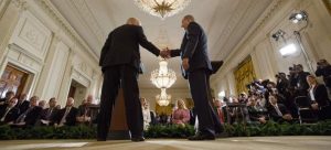 «Κοιτάζω τη λύση των δύο κρατών και του ενός κράτους και μου αρέσει αυτή που αρέσει και στις δύο πλευρές», είπε ο Αμερικανός πρόεδρος. «Μπορώ να ζήσω με οποιαδήποτε από τις δύο λύσεις. Το σκέφτηκα για λίγο και φαινόταν ότι η λύση των δύο κρατών μπορεί να είναι ευκολότερη, αλλά ειλικρινά αν ο Μπίμπι, αν το Ισραήλ και οι Παλαιστίνιοι είναι χαρούμενοι, είμαι χαρούμενος και εγώ με τη λύση που τους αρέσει περισσότερο», πρόσθεσε, αναφερόμενος στον Νετανιάχου με το παρατσούκλι του.