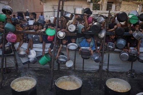 Παιδιά και ενήλικες περιμένουν να λάβουν φαγητό από μια φιλανθρωπική κουζίνα στην πόλη της Γάζας χθες. Πίστωση: Jehad Alshrafi/AP