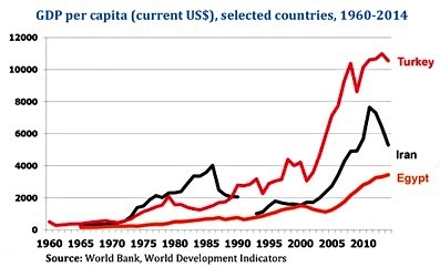 Their most major difference concerns the attitudes of their subjects. Whereas Khamene’i enjoys the support of only about 15 percent of the populace, Erdoğan can count on some 45 percent, affording Erdoğan a legitimacy and confidence that Khamene’i can only dream of. In part, this results from longevity under Islamist rule, in part from difference in per capita income, which is only US$4,700 and stagnant in Iran, $10,700 and rising in Turkey.