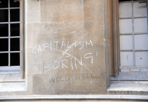 Capitalists make it seems as if there is no alternative because they hoard all the money, have all the hired guns, and pay off teams of servile lawyers, judges, and lobbyists to write and enforce their anti-life laws. Capitalists demand “law and order” whenever their servant classes get too restless. In general, the most hardened, dogmatic capitalists exhibit bewilderment and/or disgust at genuine human emotions like joy, creativity, spontaneity, and love. Many capitalists have an unconscious death wish, and want to drag the rest of us and the mother Earth down with them.