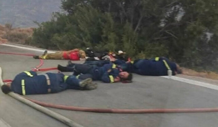 Η σελίδα Fire Fighting Greece κοινοποίησε τη φωτογραφία από τους αποκαμωμένους πυροσβέστες που απεικονίζει πλήρως τη σκληρή μάχη με τις φλόγες που δίνουν φθάνοντας στα όριά τους.