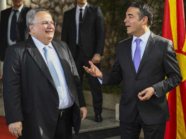 | Greek Foreign minister nikos kotzias and his Macedonian counterpart, Nikola Dimitrov in Ohrid. Photo: EPA / Georgi Licovski |