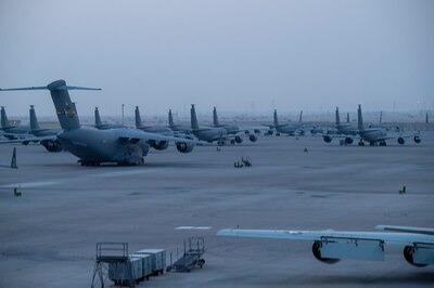 C-17 Globemaster llls and KC-135s sit on the flightline Aug. 19, 2021, at Al Udeid Air Base, Qatar. (U.S. Air Force photo by Senior Airman Noah D. Coge