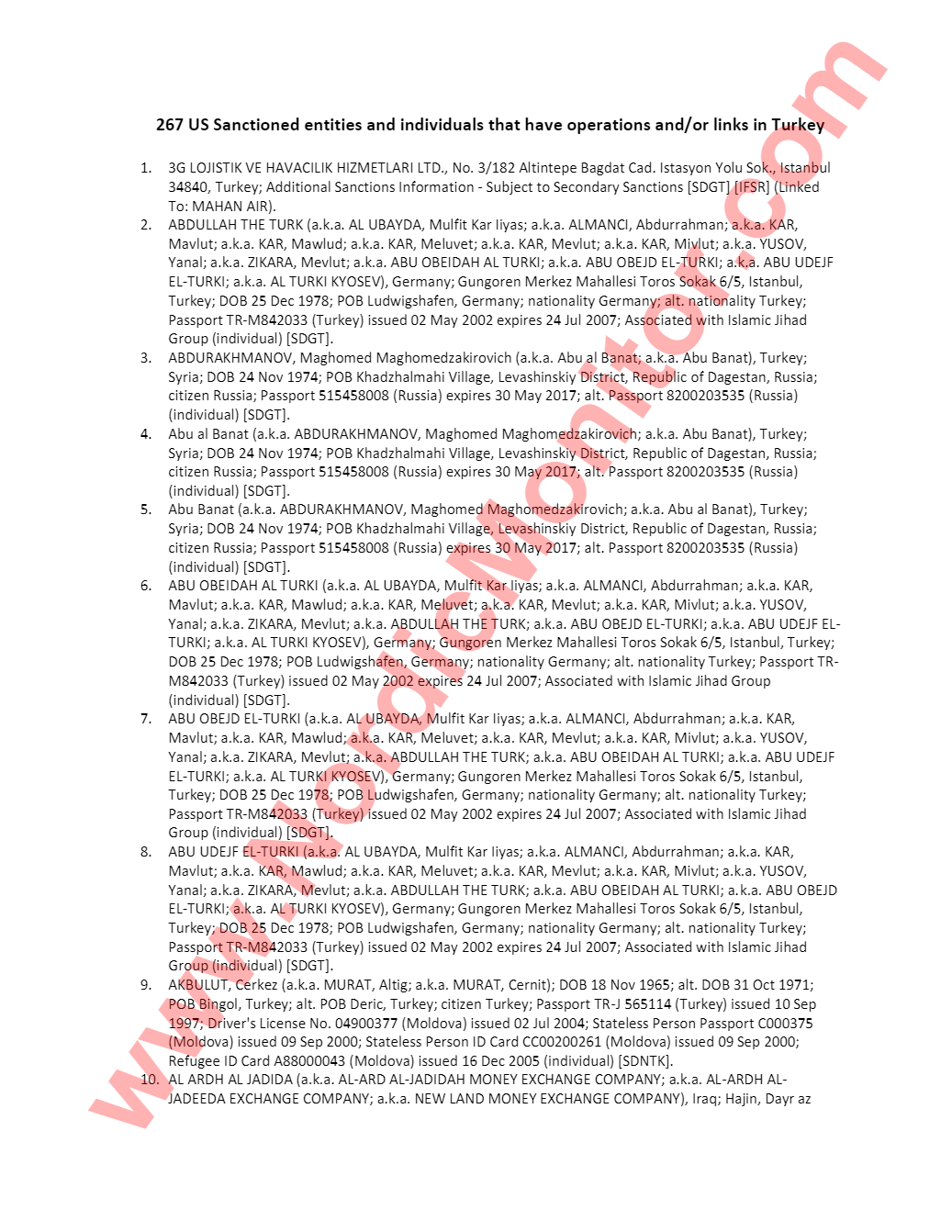 The 29-page document that lists 267 US-sanctioned entities and individuals that have operations and/or links in Turkey: