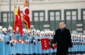 Turkish President Recep Tayyip Erdogan reviews a guard of honor at the presidential palace in