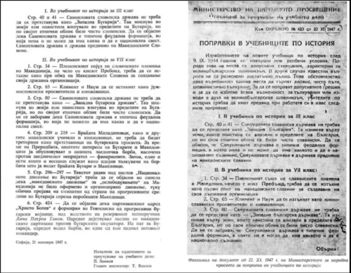 Το προαναφερθέν έγγραφο χρονολογείται από 22 Νοεμβρίου 1947. Το έγγραφο αναφέρει ότι οι αλλαγές (που θα γίνουν στη βουλγαρική ιστορία) αποσκοπούν στην αποτροπή του μεγαλοβουλγαρικού σωβινισμού και σχετίζονται με διαφορετικές ιστορικές περιόδους.