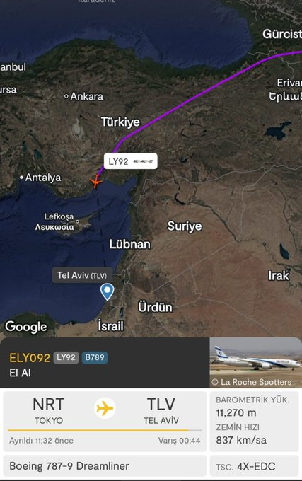 ένα αεροπλάνο των Ισραηλινών Αερογραμμών απογειώνεται από το Τόκιο, περνά πάνω από την Τουρκία και κατευθύνεται προς το Τελ Αβίβ.