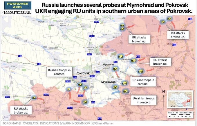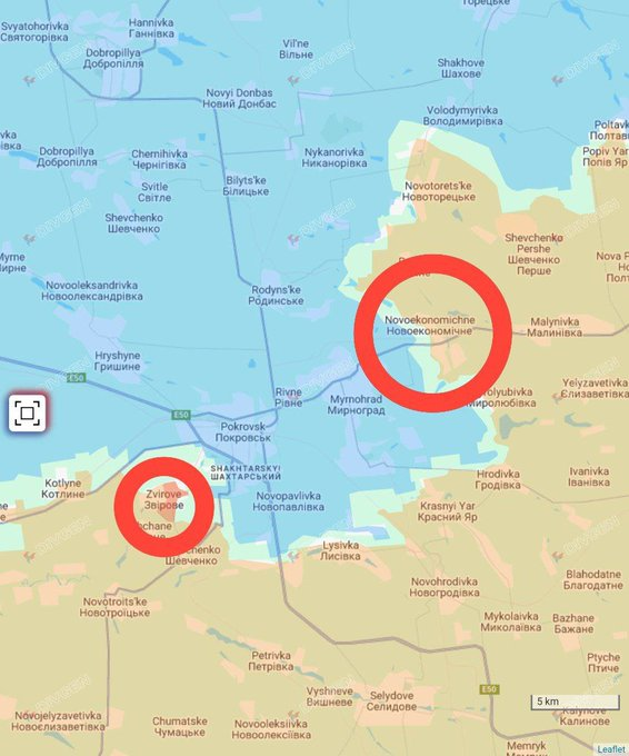 Οι ουκρανικές δυνάμεις ανακατέλαβαν το χωριό Κιντρατίβκα, στην κατεύθυνση Χότιν, στην περιφέρεια Σούμι.Ρωσική ομάδα «Κέντρου» απελευθέρωσε το Νοβοοικονομικέσκοε και το Ζβέρεβο — Η πλευρά του Κρασνοαρμέισκ καταρρέει Σύμφωνα με το ρωσικό Υπουργείο Άμυνας, η ομάδα «Κέντρου» κατέλαβε το Νοβοοικονομικέσκοε και το Ζβέρεβο στη Λαϊκή Δημοκρατία του Ντόνετσκ, καταστρέφοντας περαιτέρω τις ουκρανικές άμυνες στον άξονα του Κρασνοαρμέισκ (Ποκρόφσκ). Αυτή η επιχείρηση σφίγγει τον κλοιό περικύκλωσης και διαταράσσει τις γραμμές ανεφοδιασμού.τα ρωσικα στρατεύματά έφτασαν στα προάστια του Ντιμίτροβ.