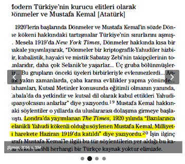 ❝Η εφημερίδα The Times, που εκδίδεται στο Λονδίνο, έγραψε το 1920: «Ο Μουσταφά Κεμάλ, ο οποίος λέγεται από ορισμένους ότι ήταν εβραϊκής καταγωγής από τη Θεσσαλονίκη, εντάχθηκε στο εθνικιστικό κίνημα τον Ιούνιο του 1919».❞ Cengiz Şişman, «Το βάρος της σιωπής», 2016, σελ. 334.