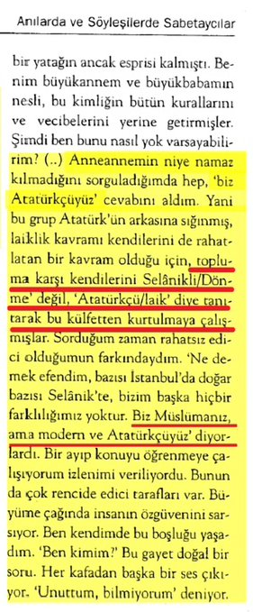 Βλέπω ότι ο κουνιάδος μου νηστεύει, αλλά δεν είναι Ραμαζάνι. Πλησιάζει το Ραμαζάνι, δεν νηστεύουν. Ρωτάω τη γιαγιά μου γιατί δεν προσεύχεται, λένε ότι είμαστε Ατατούρκοι. Καταλαβαίνω ότι χρησιμοποίησαν τον Ατατούρκ ως κάλυμμα για να κρύψουν το γεγονός ότι είναι προσήλυτοι.