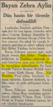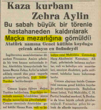Εφημερίδα Haber, 2 Δεκεμβρίου 1935, σελ. 1) ❝Δεσποινίς Zehra Aylin. κηδεύτηκε χθες με μια θλιβερή τελετή❞ (εφημερίδα Cumhuriyet, 3 Δεκεμβρίου 1935, σελ. 2) Κέντρο υγείας Şişli, Τζαμί Ενθάρρυνσης και νεκροταφείο Maçka..