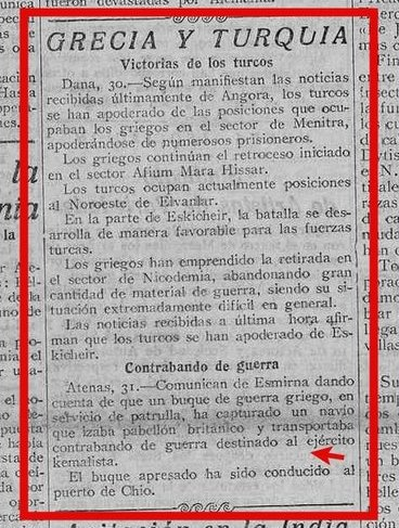 Η ισπανική εφημερίδα La Libertad γράφει: Παράνομο πολεμικό υλικό Αθήνα, 31 Αυγούστου — Σύμφωνα με αναφορές από τη Σμύρνη, ένα ελληνικό αντιτορπιλικό που περιπολούσε κατέλαβε ένα μεταγωγικό πλοίο με βρετανική σημαία που μετέφερε λαθραίο πολεμικό υλικό για να παραδοθεί στον κεμαλικό στρατό. Το συλληφθέν πλοίο μεταφέρθηκε στο λιμάνι της Χίου.