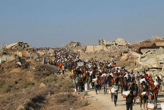 Παλαιστίνιοι μεταφέρουν προμήθειες βοήθειας που εισήλθαν στη Γάζα μέσω Ισραήλ, στην Μπέιτ Λαχία στη βόρεια Λωρίδα της Γάζας, την Κυριακή. Πίστωση: Ebrahim Hajjaj/Reuters